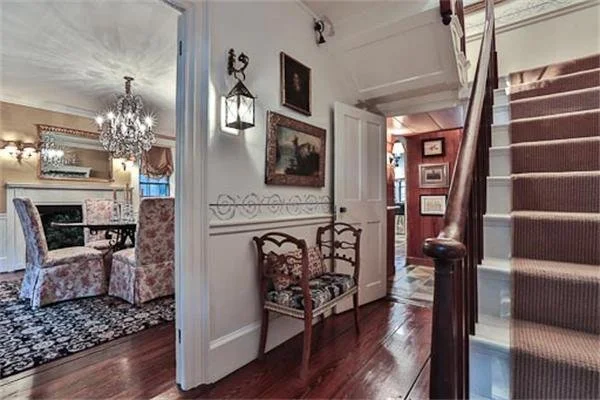 An old-world French inspired restoration of an 1819 Federalist home reflecting its history when interior design changed in reaction to the overthrow of the crown, from English décor to French influences with the local elite importing French wall coverings and textiles. The areas’ finest restoration craftsmen were enlisted to bring the restoration and addition to its rightful historical beauty. The entire house lot required new landscaping including new fencing, brick, bluestone and granite posts made from sourced granite from Boston's Big Dig complete with underground electric for exterior lighting. The chef's kitchen features reclaimed soapstone counters an antique slate sink, custom ironwork, a Lacanche stove and restored antique French light fixtures.
